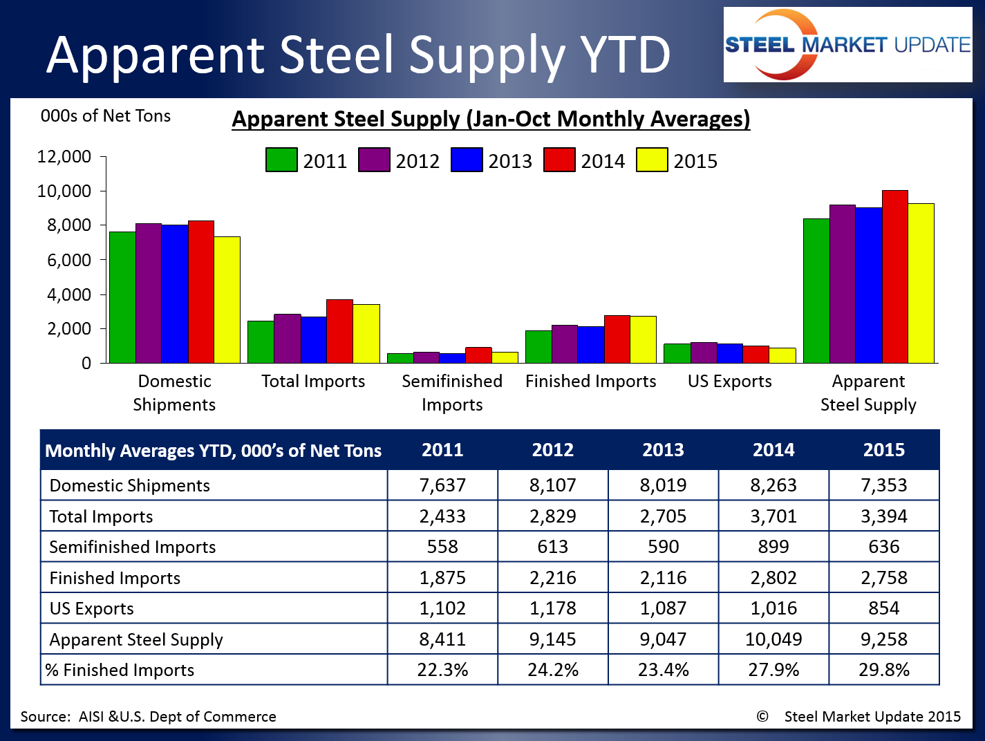 According to the latest data released from the US Department of Commerce and the American Iron and Steel Institute, apparent steel supply for the month of October 2015 was 8,868,427 net tons. Apparent steel supply is calculated by adding domestic steel shipments and finished US steel imports and subtracting total US steel exports.