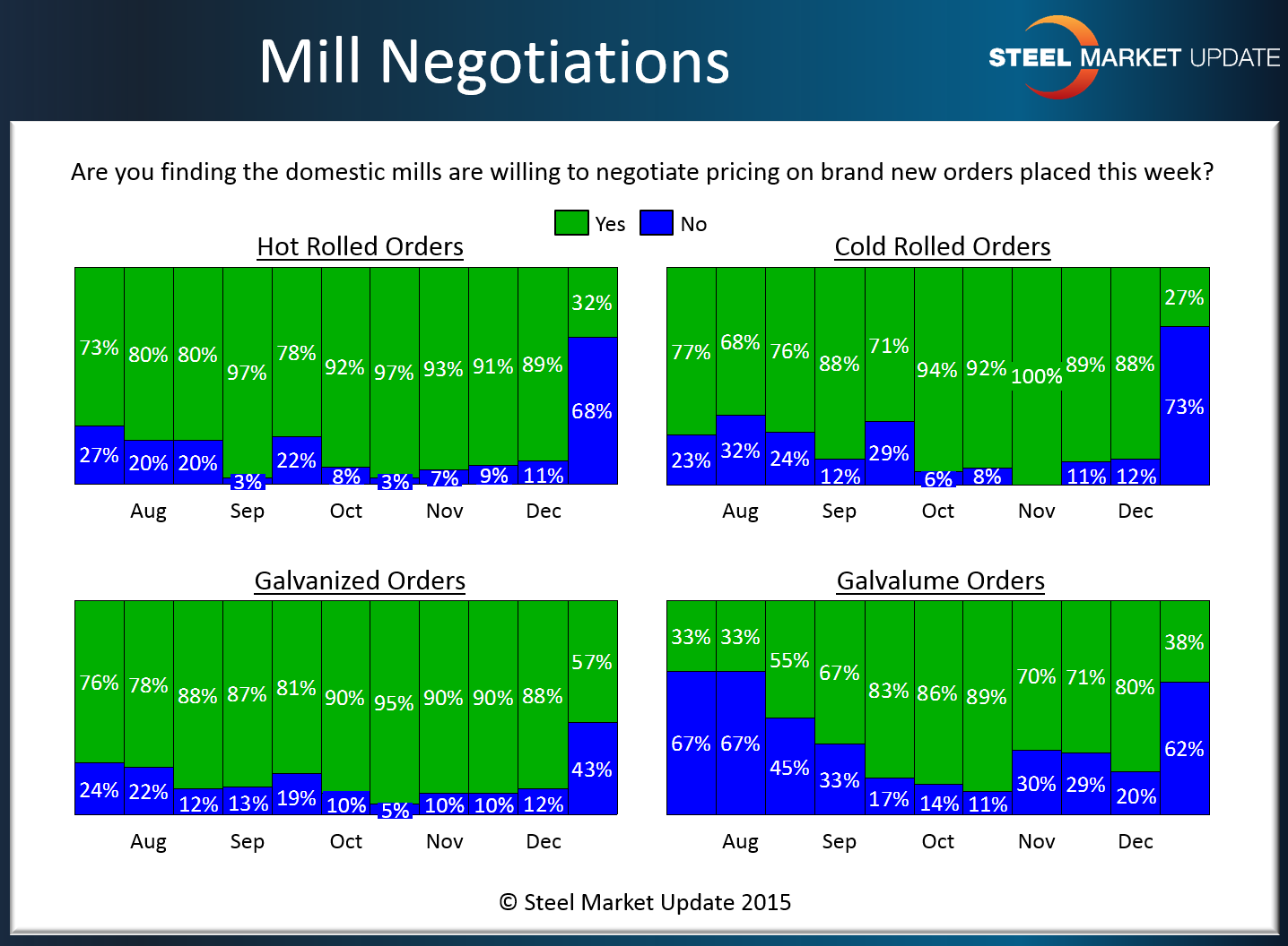 There was a significant change in the willingness of the domestic steel mills to negotiate pricing with their customers after the price announcements were made. According to the results of this week’s flat rolled market analysis conducted by Steel Market Update all products saw the percentage of those reporting the mills as willing to negotiate as dropping.