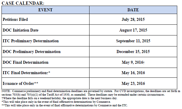The next important date for the cold rolled trade suits is February 24, 2016 when the US Department of Commerce is scheduled to release (subject to extension) their Preliminary Determination on the antidumping (AD) portion of the trade suits (above was countervailing duty portion only). The next step for the countervailing duty suit is for the Final Determinations from both the US Department of Commerce as well as the International Trade Commission (ITC). Those dates are listed in the table below.