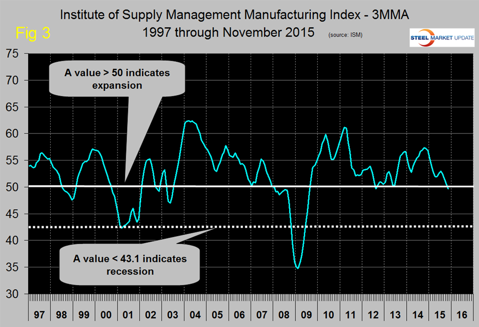 SMU Comment: The IP data is similar to the ISM Manufacturing Index which also contracted very slightly in November after expanding at a decreasing rate since October last year. Figure 3 shows the ISM manufacturing index since January 1997.