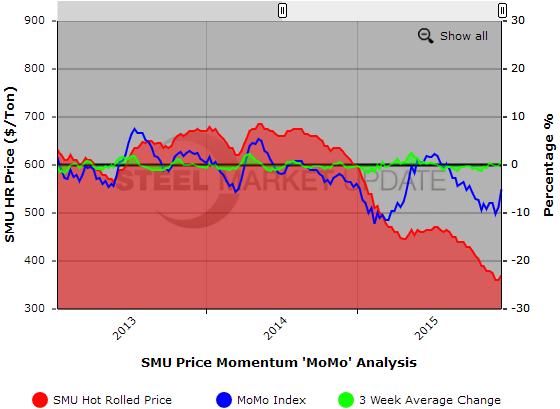 The graph below demonstrates the relationship between the SMU hot rolled coil price, the SMU Price MoMo Index, and the three week moving average change in the MoMo Index. As published in our Tuesday evening issue, the SMU HRC price range for this week is $340-$400 per ton with an average price of $370, up $10 per ton from from last week.