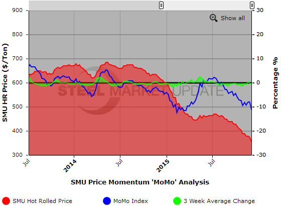 The Steel Market Update (SMU) Price MoMo Index for hot rolled steel in the United States was negative (indicating lower prices) for the 17th consecutive week. MoMo, a trailing indicator, is measured as a percentage and shows the relation of the current U.S. hot rolled coil (HRC) price movements against the previous 12-week average spot price as recorded by Steel Market Update. A positive MoMo index indicates hot rolled steel prices are increasing, while a negative index indicates a decline in prices.