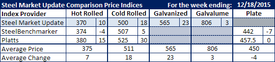 Hot rolled prices rose on all but SteelBenchmarker (who only reports prices twice per month) as we took our HRC index up $10 per ton to $370 per ton while Platts was up $15 per ton to $380. The average of the three indices is $375 per ton.