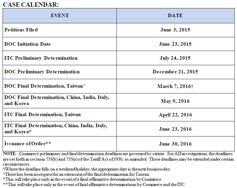 On December 22, 2015, the Department of Commerce (Commerce) announced its affirmative preliminary determinations in the antidumping duty (AD) investigations of imports of corrosion-resistant steel products from China, India, Italy, and Korea, and its negative preliminary determination in the AD investigation of imports of corrosion-resistant steel products from Taiwan.