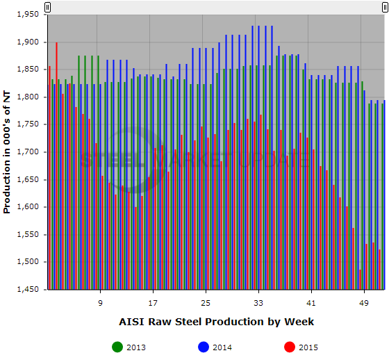 For the week ending December 19, 2015, the American Iron & Steel Institute (AISI) estimated the U.S. steel industry produced 1,523,000 net tons of raw steel, a 0.8 percent decrease over the previous week and a 15.2 percent decrease over the same week one year ago. The estimated capacity utilization rate is 63.7 percent, down from 64.2 percent last week and down from 74.6 percent this time last year.