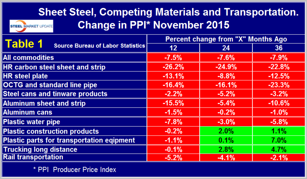 Our analysis of the PPI data shows that commodity prices as a whole declined by 7.5 percent in 12 months through November and were also down on a two and three year comparison. The decline on this basis is quite consistent. Commodity prices in general were back to where they were over five years ago in October 2010. A rising $ will put downward pressure on commodity prices and the demand side of the equation is exacerbating currency effects at this time. Of particular interest in this analysis is that the decrease in price of both steel and aluminum cans continues to bear no relationship to their raw sheet products. In a similar vein the prices of plastic construction products and plastic parts for transportation equipment have declined very little in the last 12 months in spite of the collapse in hydrocarbon prices. In the last 12, 24 and 36 month periods hot rolled steel sheet and strip have declined in price by much more than aluminum sheet and strip.