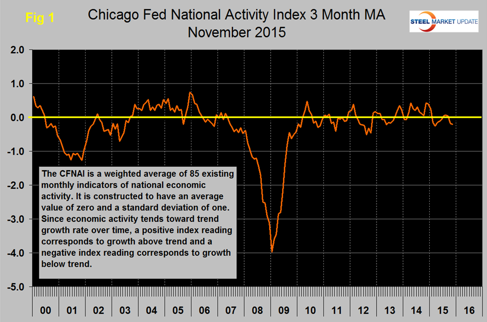 The following is the Chicago Federal Reserve statement followed by our own graphical analysis. The CFNAI is an excellent reality check for much of the economic analysis that we routinely provide in The Steel Market Update and is also a reasonably good predictor of the direction of steel demand with a six to nine month lead. For example by the time the steel market went off the cliff in September 2008, the CFNAI had been signaling an increasingly severe problem for eight months. Then in the first Q of 2009 the CFNAI was recovering as steel supply was still going south. An explanation of the Index is provided at the end of this piece.