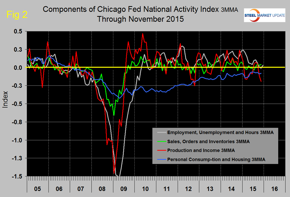 The CFNAI has declined for four straight months through November and has declined in nine of the first eleven months of 2015 (see explanation below). Figure 1 shows the SMU analysis of the three month moving average (3MMA) through November and that the index was slightly positive each month July through September, declined to negative 0.18 in September and again to negative 0.20 in November.