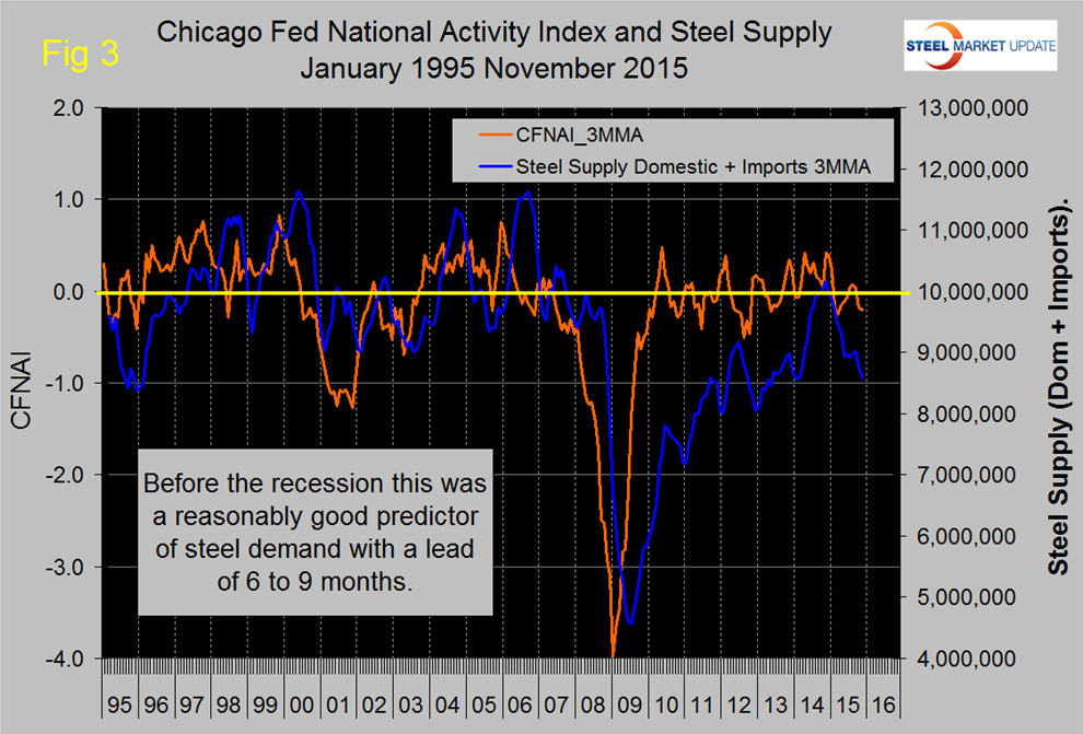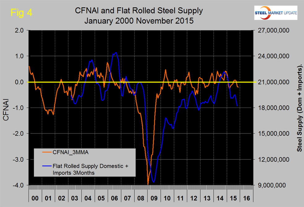 The difference is quite dramatic and qualitatively in agreement with our analysis of steel service center shipments. Flat rolled driven mainly by manufacturing came back in line at the end of 2014 but this year has fallen off again as demand from the energy sector has collapsed. Long products driven mainly by construction is still depressed and since the recession has not come anywhere near where this benchmark predicts. Based on the historical lead of the CFNAI it no longer looks as though total steel demand will pick up through Q1 2016. Note; steel supply shown is only through October as that is the latest data available.