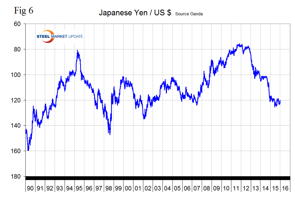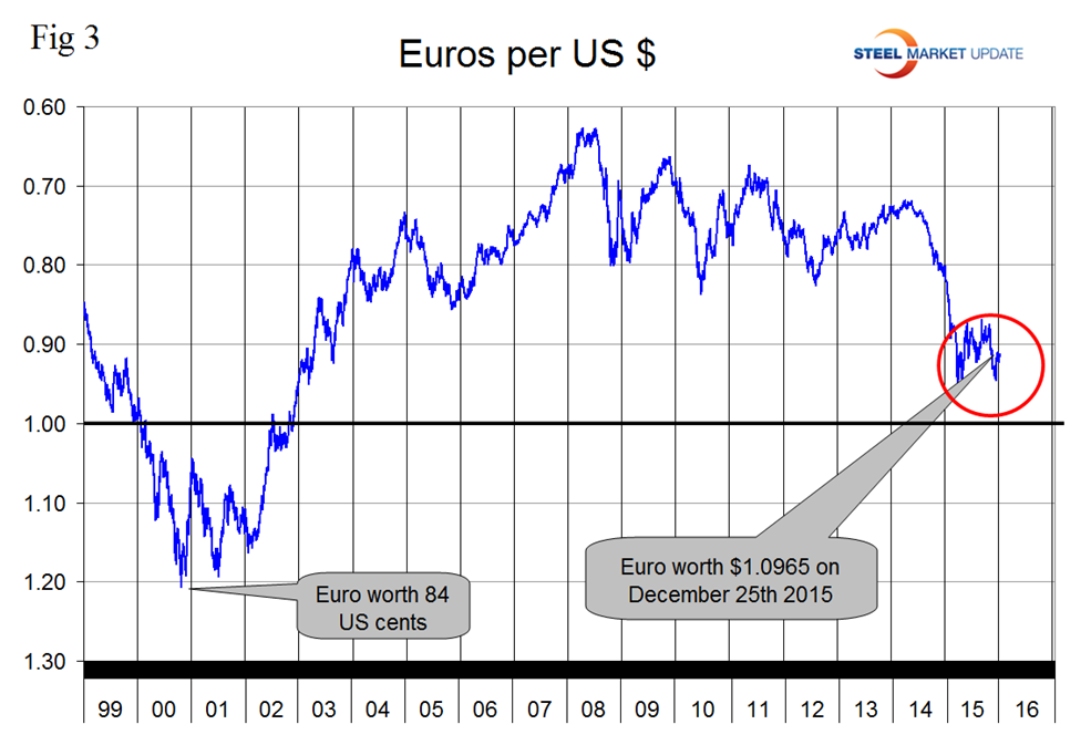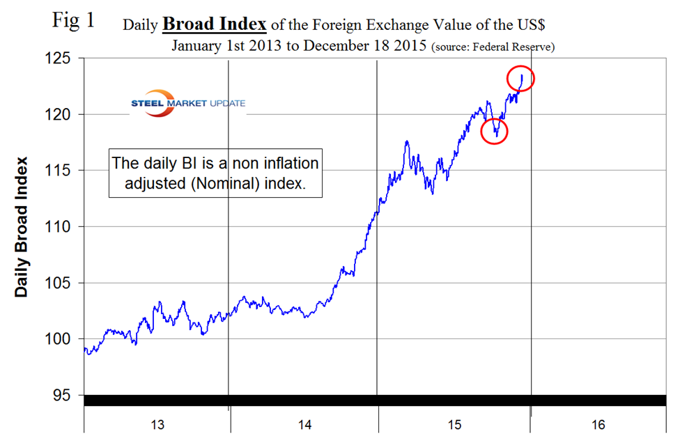 As of December 25th, the latest data for the Broad Index value of the US $ against the currencies of our major trading partners was December 18th, two days after the increase in the federal funds rate and seven days behind the individual steel trading currency data that we are presenting here. This is important because currencies are volatile in the current environment where the US is raising interest rates and Europe and Japan are intensifying quantitative easing. The daily BI peaked on December 17th at 123.5, its highest value since March 2003. On December 18th it fell to 122.9