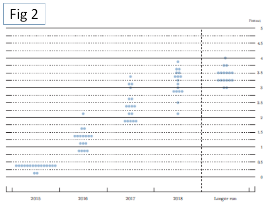 Figure 2 shows schematically when the 17 individual members of the board of the Federal Reserve expect interest rates to increase and by how much.