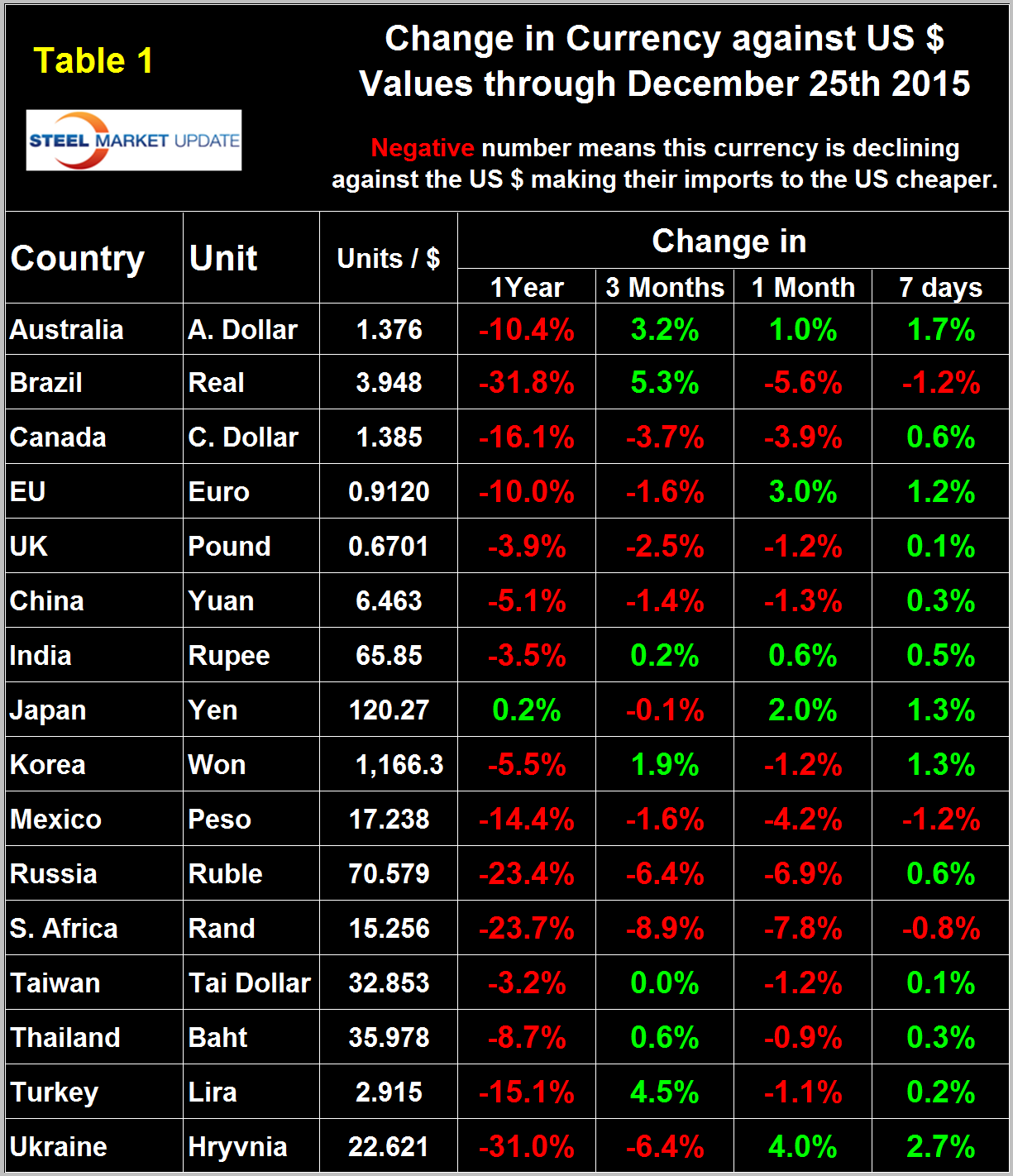 In each of these reports we comment on a few of the 16 steel trading currencies listed in Table 1 and include extracts from sources that we have come across and that we deem credible. Charts for each of the 16 currencies listed in Table 1 are available through December 25th for any reader who requests them.
