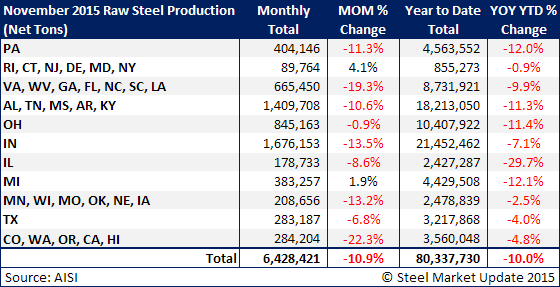 The American Iron & Steel Institute (AISI) recently reported final raw steel production estimates for the month of November 2015. The monthly estimates are different than the weekly estimates we report in our Tuesday issues; the AISI bases the monthly estimates on 75 percent of the domestic mills reporting vs. only 50 percent for the weekly estimates.
