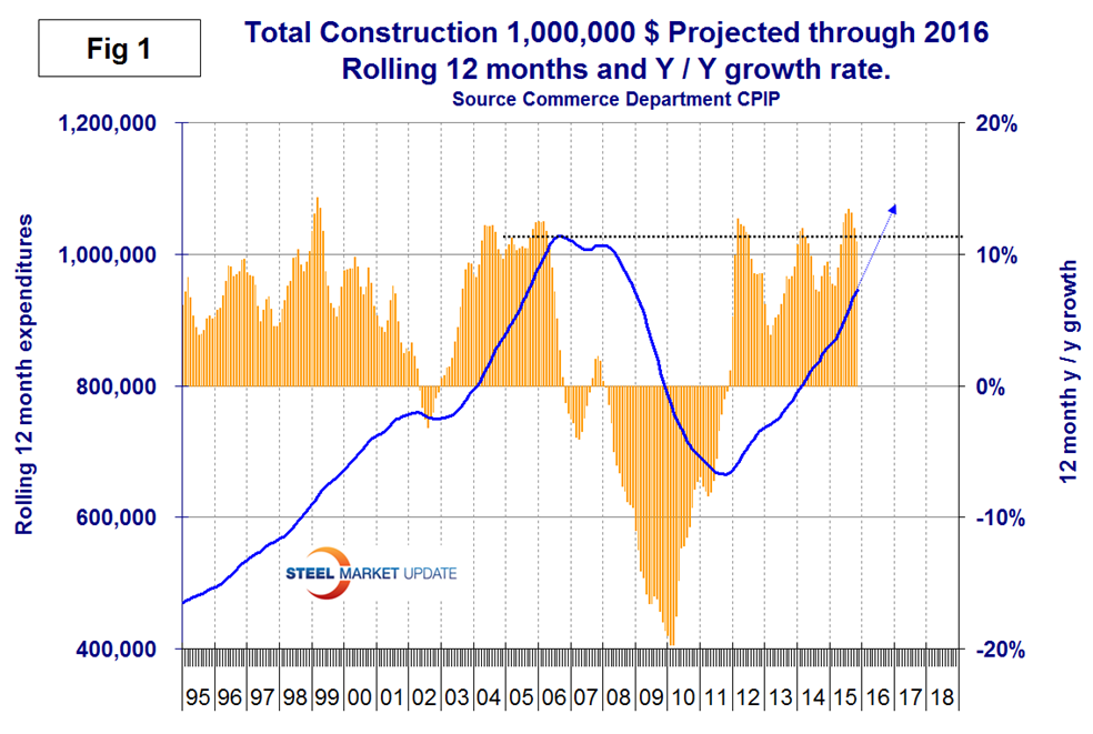On a rolling three month basis y/y total construction was up by 10.9 percent led by private work up by 13.2 percent. Total construction growth was accelerating through October but in November flattened out since the short term growth (3 months) was the same as the long term (12 months). We report this as zero momentum. Note there is no seasonality in our analysis because we only report year over year results. Federally financed work had positive momentum in 3 months through November but private and state and local were flat. On a rolling 12 month basis Federal construction declined every month for 43 months with September’s report being the first to reverse that trend with a positive 1.3 percent growth rate followed by October at + 1.7 percent and November at +1.3 percent. We consider four sectors within total construction. These are non-residential, residential, infrastructure and other. The growth rate of non-residential buildings, residential buildings and infrastructure are good but all three have negative momentum. The growth rate of “other” which mainly consists of industrial, utilities and power projects became very negative at the time of the oil price collapse a year ago but has recovered to positive growth in the last three months on a 3MMA basis. Infrastructure grew 5.6 percent in three months through November year over year with negative momentum and other grew by 3.9 percent with a very positive momentum. The growth rate of total construction slowed in the first three months of this year but improved at a double digit rate every month since then as shown by the brown bars in Figure 1. The pre-recession peak of total construction on a rolling 12 month basis was $1,145 B in 12 months through February 2007. The low point was $665.1 B in 12 months through October 2011. The 12 month total through the latest data of November 2015 was $945.7 B. July through November were the first months to exceed $900 B since April 2009 when the recession was gaining traction.