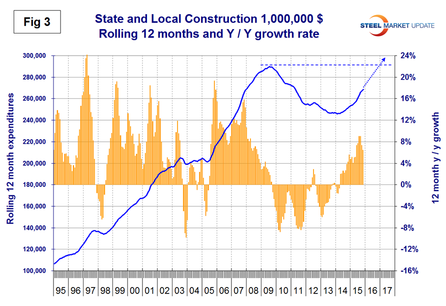 Drilling down into the private and S&L sectors as presented in Tables 2 and 3 shows which project types should be targeted for steel sales and which should be avoided. There are also regional differences to be considered for which data is not available from the Commerce Department. In December 2015 the Bureau of Labor Statistics initiated the reporting of GDP data by state and by sector, including construction and when the next update is released in March we will initiate a routine analysis for our subscribers.