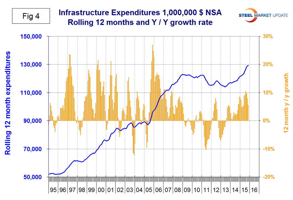 Infrastructure expenditures were slow to respond to the recession due to the magnitude of many of these projects. Growth stopped in 2009 and 2010 but it wasn’t until 2011 that an actual contraction occurred. For most of 2015 infrastructure expenditures have exceeded the pre-recession high (Figure 4).
