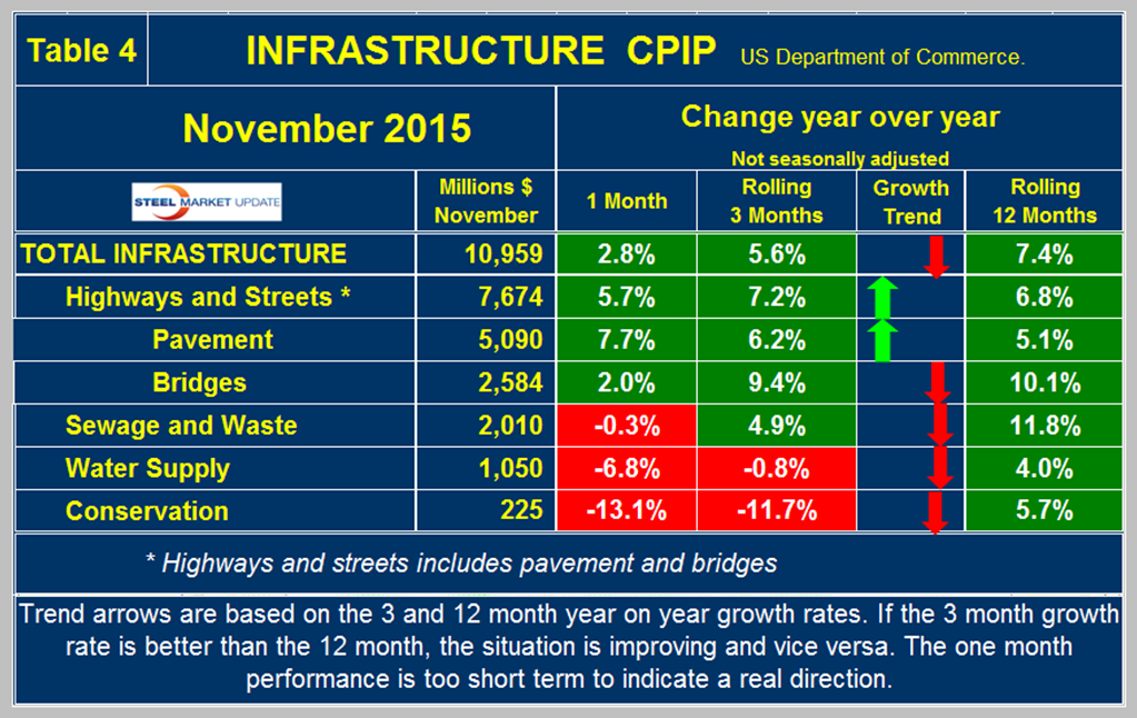 Expenditures have had positive growth every month since July 2013 with a +5.6 percent result in the latest data with negative momentum. Highway and streets including pavement and bridges accounts for about 2/3 of total infrastructure expenditures and had positive growth for 15 months through February, contracted in March and April then had positive growth ever since culminating in a 7.2 percent rate in three months through November. Highway pavement is the main subcomponent of highways and streets and had a 6.2 percent positive growth in three months through November. Bridge work contracted every month in the period August through November 2014 but has since expanded every month with an accelerating trend. Bridge work totaled $2.6 billion in the single month of November with a strong 9.4 percent growth rate (Table 4).