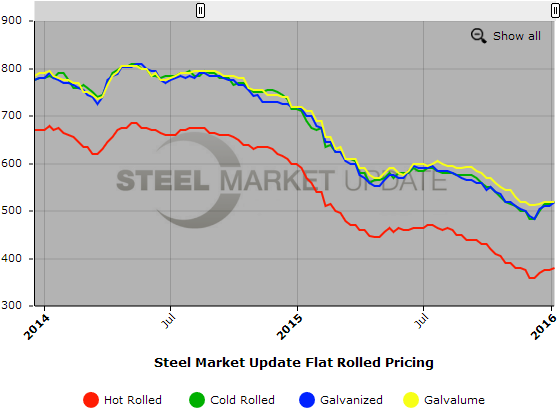SMU Note: Below is a graphic showing our hot rolled, cold rolled, galvanized, and Galvalume price history. To use the graphs interactive capabilities, you must view it on our website here. If you need help navigating the website or need to know your login information, contact us at info@SteelMarketUpdate.com or by calling 800-432-3475.