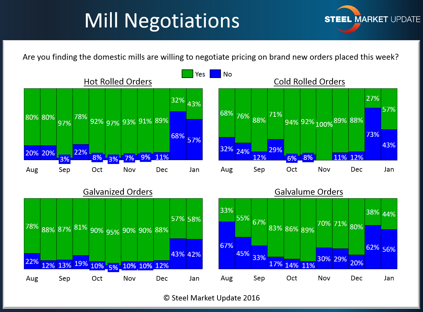 As we mentioned, as lead times begin to move out the percentage of buyers who are reporting the domestic mills as willing to negotiate pricing has been shrinking. The graphic below puts this into historical perspective and you can clearly see the change which began in mid-December and continues in early January.
