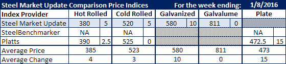 We are seeing small adjustments higher in hot rolled, cold rolled and galvanized pricing based on what our index, along with that of Platts, reported this past week.