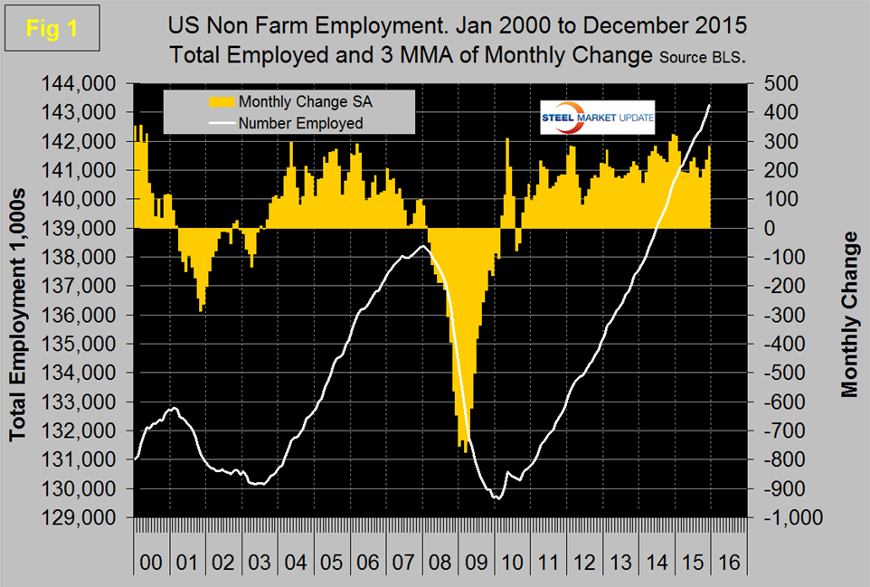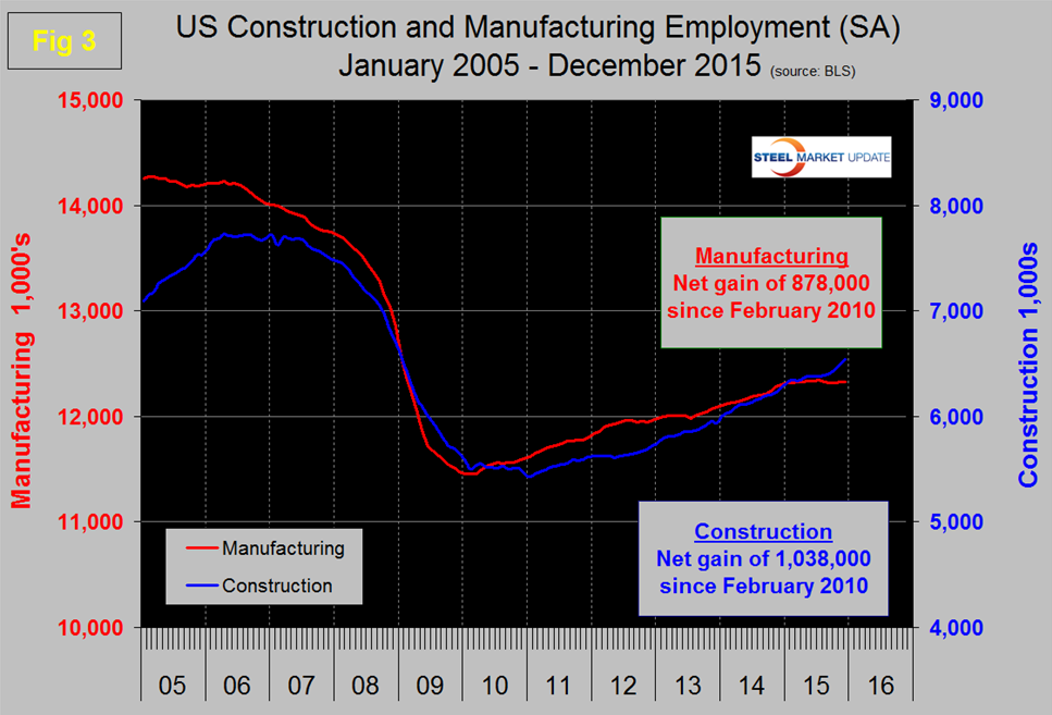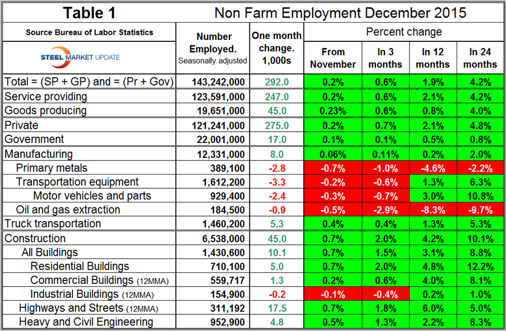 Total employment equals the sum of private and government employees. It also equals the sum of goods producing and service employees. Most of the goods producing employees work in manufacturing and construction and the major components of these two sectors are also shown in Table 1. In December, 275,000 jobs were created in the private sector and 17,000 in government. The growth of government jobs was split, 4,000 Federal, 6,000 State and 7,000 Local. Since February 2010, the employment low point, private employers have added 14,068,000 as government has shed 475,000. In December service industries expanded by 247,000 as goods producing industries added 45,000 people. Since February 2010, service industries have added 11,569,000 and goods producing 2,024,000 positions. Table 1 shows that manufacturing gained 8,000 jobs in December. In all of 2015, manufacturing has added 25,000 jobs. Last month we reported that the gain in manufacturing jobs in 2015 through November was zero. The big change was in the October revision. Note the subcomponents of both manufacturing and construction shown don’t add up to the total because we have only included those that have most relevance to the steel industry. Primary metals lost 2,800 jobs in December, is down by 4.6 percent in the last 12 months and has not had a single positive growth month in 2015. Motor vehicles and parts lost 2,400 jobs in December, oil and gas extraction has had negative job creation in all four time periods examined in Table 1. Truck transportation gained 5,300 jobs in December and is up by 1.3 percent in 12 months. Construction added 45,000 jobs in December for a total of 128,000 in the 4th Q and 263,000 for the year. Some of the major construction sub categories are routinely reported one month in arrears which distorts the data in Table 1. These include, industrial buildings, commercial buildings and highways and streets. Construction employment increased in 190 out of 358 metro areas, was unchanged in 64 and declined in 104 between November 2014 and November 2015, according to a new analysis of federal employment data released today by the Associated General Contractors of America. Association officials noted that the number of metro areas experiencing construction job growth continues to grow as firms appear to be having an easier time finding workers in spite of reports of worker shortages.