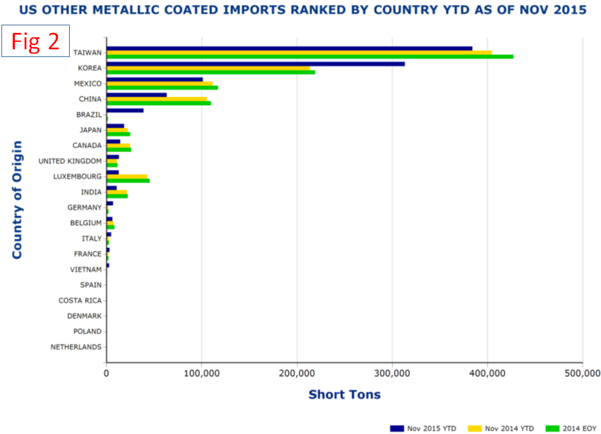 South East Asia had the highest regional total with Taiwan and Korea being by far the most prolific sources within that region. Tonnage from SE Asia was up by 4.7 percent YTD and from NAFTA, the second largest source was down by 15.4 percent. Figure 2 shows the YTD tonnage by country compared to the same period in 2014 and the final total for 2014 for comparison.