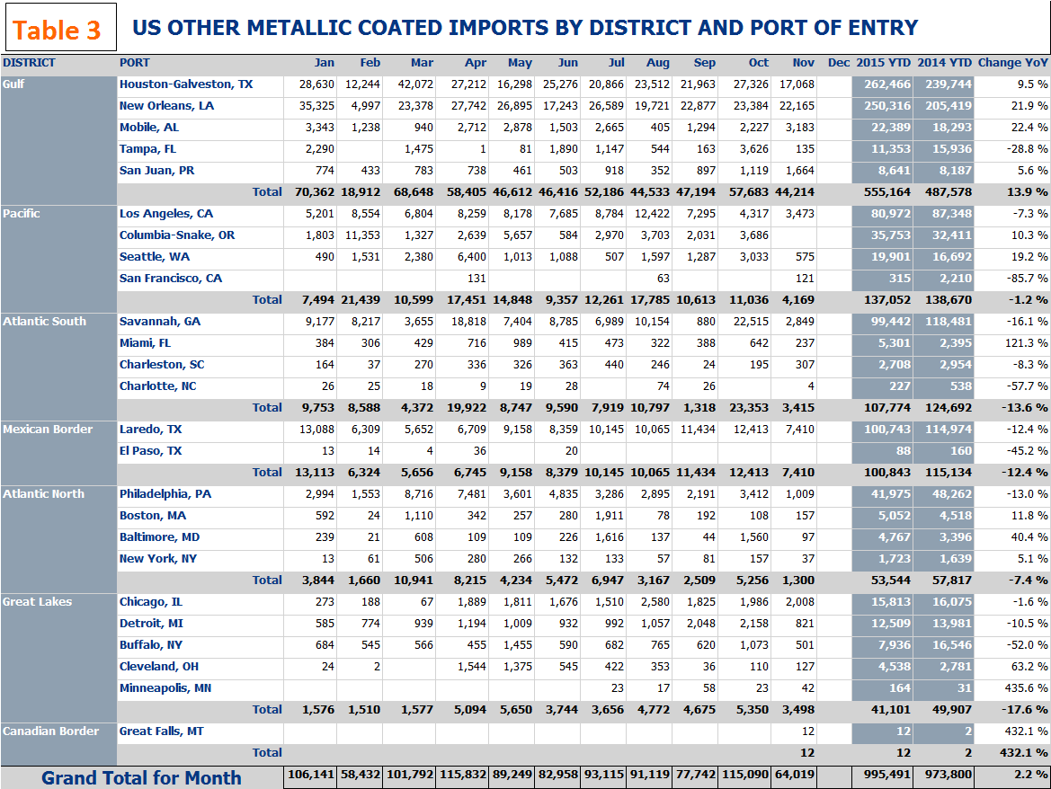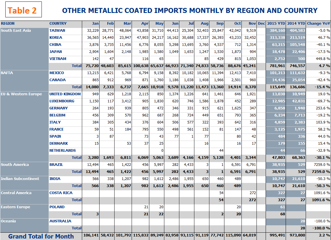 Table 2 drills down to tons by country and subtotaled by global source region by month for the first 11 months of 2015.