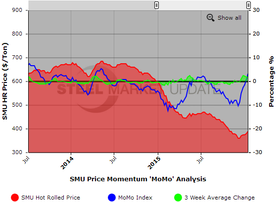 MoMo was measured at 3.43 percent this week, meaning that the current HRC price is higher than the average price over the last 12 weeks.