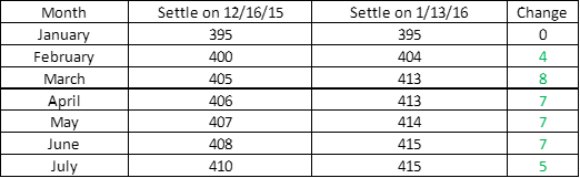 In our last edition, which has been nearly a month ago due to the holiday break, we wondered about whether the price increases announced in December would be enough to turn the tide on crumbling HRC prices. It looks at this point as though we can firmly answer “yes” to that inquiry, but that doesn’t give us much more insight into the really crucial question; does this mini-rally in steel prices have some staying power, or will it fizzle before long? Here is a look at the price action since our last edition, and you will notice that while prices are certainly up, the contango that was already being priced in accounted for a lot of the price increase already. The result is modestly higher Feb-Dec16 valuations: