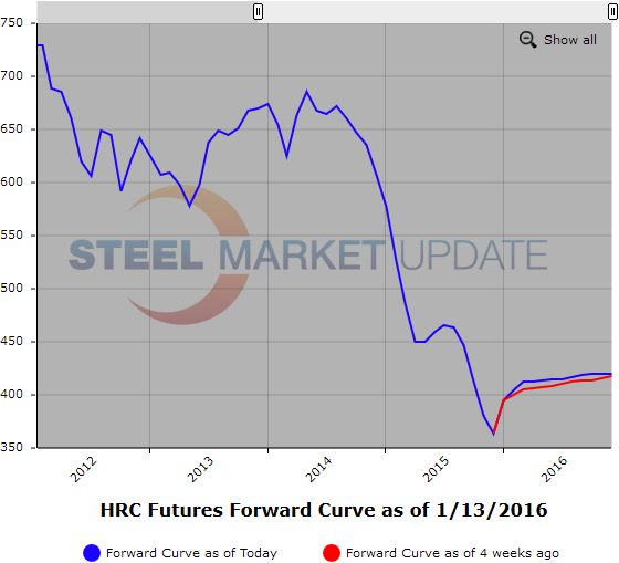 Below is a graphic of the HRC Futures Forward Curve. The interactive capability of the graph can only be used in Steel Market Update website here. If you have any issues logging in or navigating the website please contact us at info@steelmarketupdate.com or (800) 432 3475.