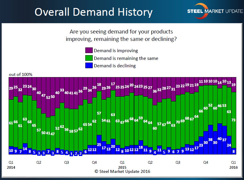 Over the last two flat rolled steel market analysis performed by Steel Market Update (the last concluding this past Thursday, January 7th) we have seen a dramatic break in the overall (all participants included) demand trend. As you can see by the graphic provided, over the past two quarters we saw the rise and peak of those reporting that demand is declining. During the past six weeks we saw the percentage of respondents reporting declining demand move from 37 percent to 24 percent and this past week that number dropped to just 8 percent.