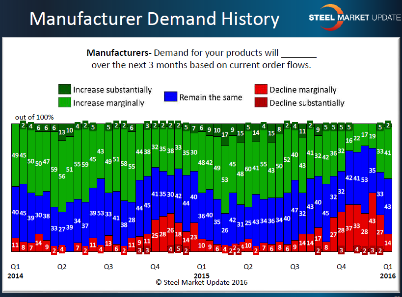 The majority of the change appears to be coming from the end user segment of our survey. We saw a strong move over the past four weeks by the manufacturing sector. Forty-three percent of the manufacturing respondents said that demand for their products was either increasing substantially (2 percent) or marginally (41 percent).