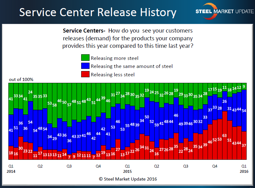 From the service center perspective we are seeing a small change but a large percentage of the service center respondents continue to report their customers as releasing less steel than at this time last year. Based on the manufacturers responses we think the red bars on the below graphic will continue to recede as business slowly improves.