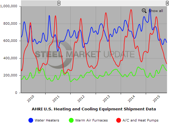 Below is a graph showing the history of water heater, warm air furnace, and air conditioner shipments. You will need to view the graph on our website to use it’s interactive features, you can do so by clicking here. If you need assistance with either logging in or navigating the website, please contact our office at 800-432-3475 or info@SteelMarketUpdate.com.