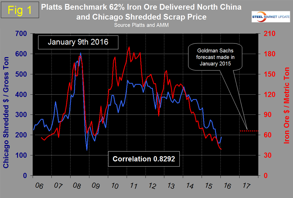 Figure 1 shows the IODEX (62% Fe delivered N. China) and the price of scrap through January 9th. The correlation since January 2006 has been 0.8292. In the period 2007 through 2009 the correlation was 0.9182 but the relationship became de-coupled in 2010 and 2011 when the big 3 ore cartel began to eliminate long term contracts.
