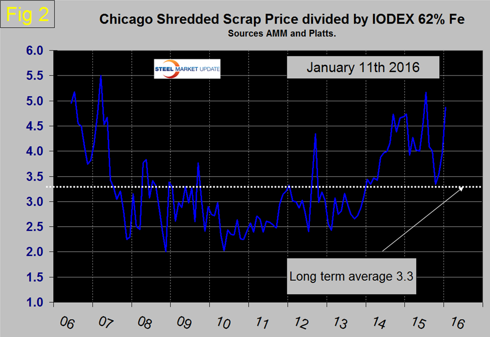 In the long term, Chicago shredded has been 3.3 times as expensive as the IODEX on average with quite a wide spread in each direction. For four years through December 2013 scrap was advantageously priced on a historical basis compared to ore. Throughout 2014 scrap became increasingly uncompetitive and in July this year reached a high of 5.2x the IODEX (Figure 2). The latest scrap price increase and iron ore decrease caused the ratio to jump from 3.97 to 4.87.