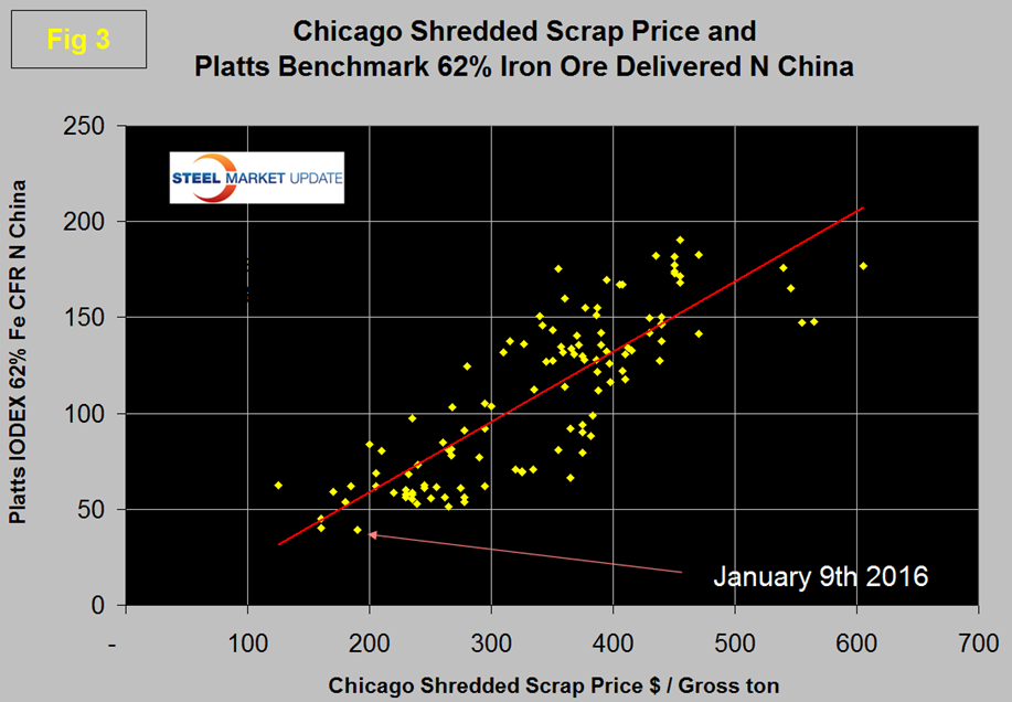 The World Steel Association data for 2014 was released recently and has China at 93 percent BOF and 7 percent EAF as a mix of steel production processes. The present advantageously priced iron ore is part of the reason why China with its high dependence on ore has been able to disrupt the global scrap market by selling low priced semi-finished. Figure 3 is a scatter diagram of scrap and ore and where we are this month.