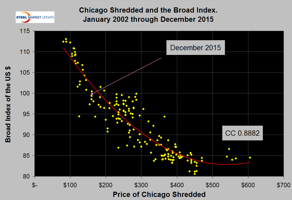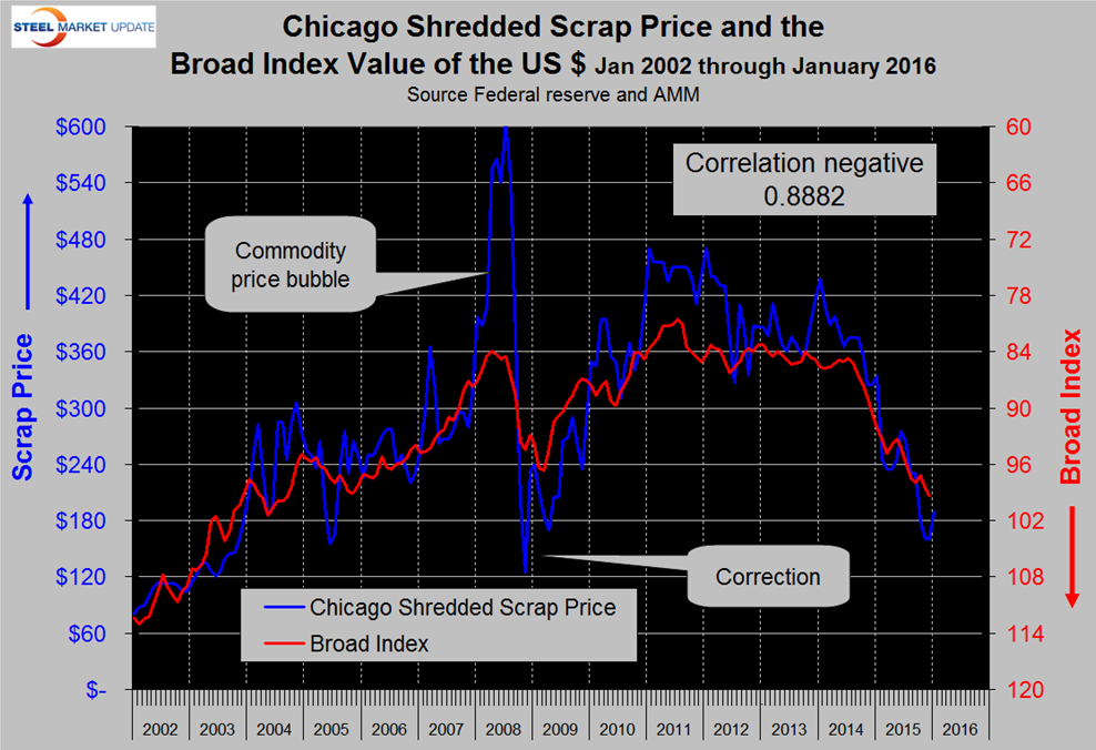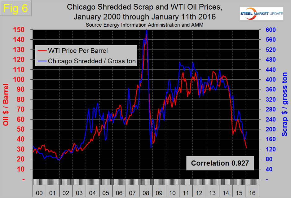 The price of ore and the value of the US $ have a direct causal effect on scrap prices. There is not a causal relationship between scrap and oil but they are both global commodities with a highly correlated price ratio. Comparison with these benchmarks has enabled us to signal whether the price of scrap is out of line either on the up or down side. The price of Chicago shredded scrap rose by $30 in January to $190 per gross ton, down from $334 in January 2015.