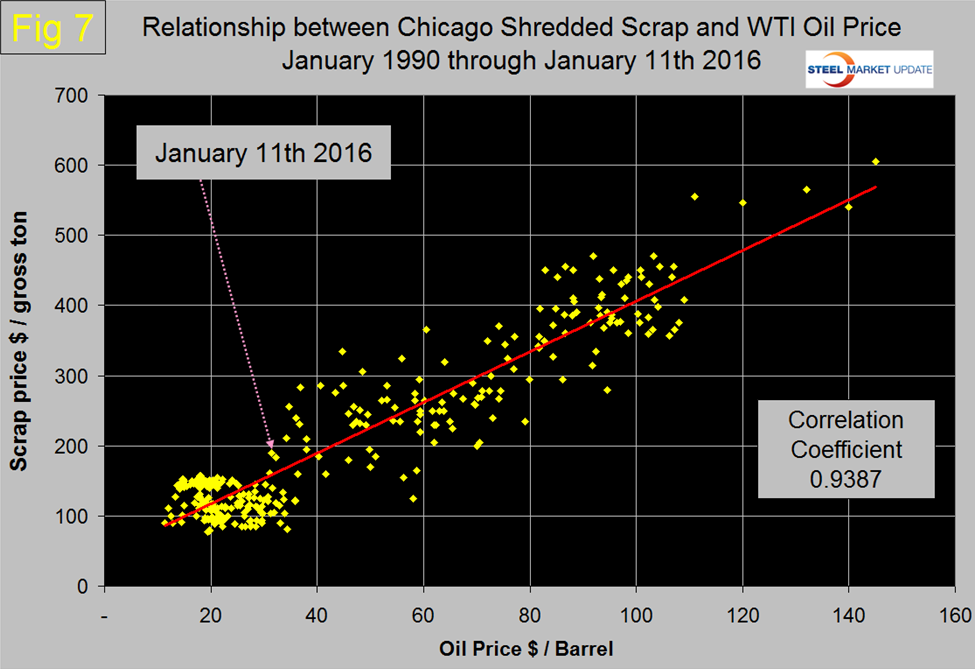It was clear in December 2014 that if history was a guide, scrap was headed for a fall and this occurred in February. Scrap followed oil down for all of 2015. In January we have an unusual situation where scrap and oil are moving in opposite directions. Figure 7 is a scatter diagram for scrap and oil prices since January 1990 and where we are today. As of now scrap is overpriced compared to both oil and iron ore but underpriced compared to the broad index value of the US $. We are inclined to think based on these benchmarks that the January price increase of scrap was driven by collection rates and not real demand, therefore, we believe the downside for scrap is greater than the upside during the balance of the first quarter of 2016.