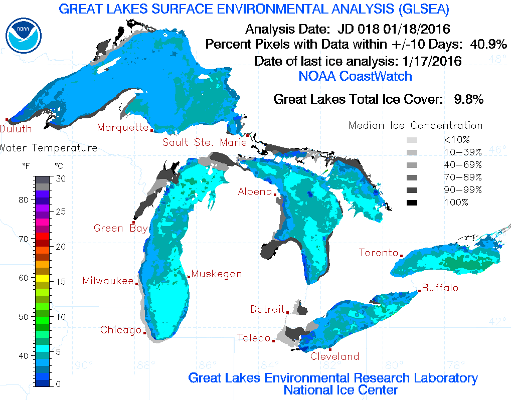 So far the 2015-2016 winter has been mild on the lakes. On this day in 2015, 22.9 percent of the Great Lakes were covered with ice and in 2014 it was even higher at 29.6 percent. This year unseasonably warm temperatures through December have kept ice formation down. Just 9.8 percent of the Great Lakes are ice covered at this time. But what really will matter is how much ice is on the Lakes in March when the locks and the season reopens.
