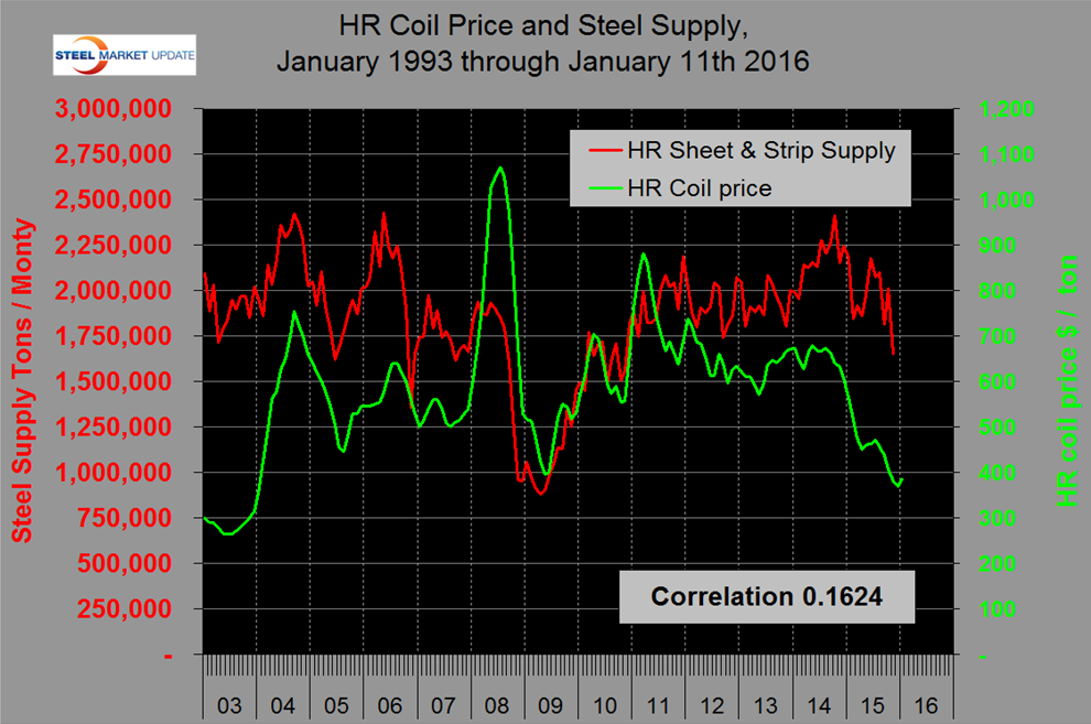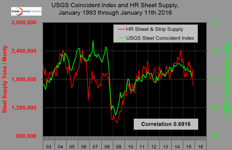 At the end of this piece we show the components of this index which seem to be well thought out and was developed by the former Center for International Business Cycle Research (CIBCR) at Columbia University. Even though this correlation isn’t very good, if we interpret the graph correctly, there is some interesting history there. In the second half of the 1990s the index and prices moved in opposite directions which we interpret as the effect of the thin slab/EAF revolution that began at Nucor’s Crawfordsville plant in 1995. There was a sharp price increase in 2004 resulting from disruption of supply from the integrated plants. This resulted from the shortage of coking coal which was due to a fire in a major West Virginia mine. In 2009 prices didn’t crash by as much as might have been expected as mills voluntarily cut production and avoided a race to the bottom. In 2014 and 2015, the price of sheet was driven down by imports. Figure 3 shows the relationship between the USGS Coincident index and hot rolled sheet supply with a correlation of 0.6916 since January 2003 and 0.9388 since September 2008.