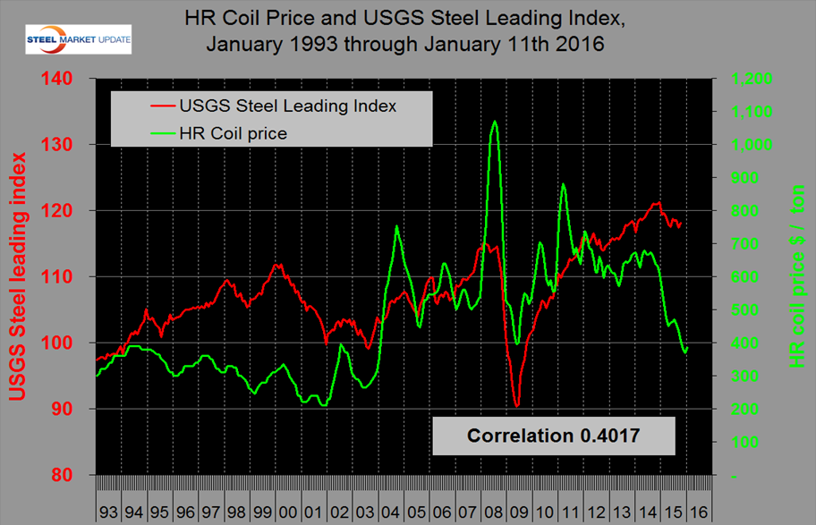 During this investigation we came across a leading index for steel demand produced by the US Geological Survey. The USGS do basic analysis into the mineral and metals industries which they don’t publicize very well. Figure 2 shows the relationship between the price of hot rolled sheet and the USGS leading index with a correlation of 0.4017.