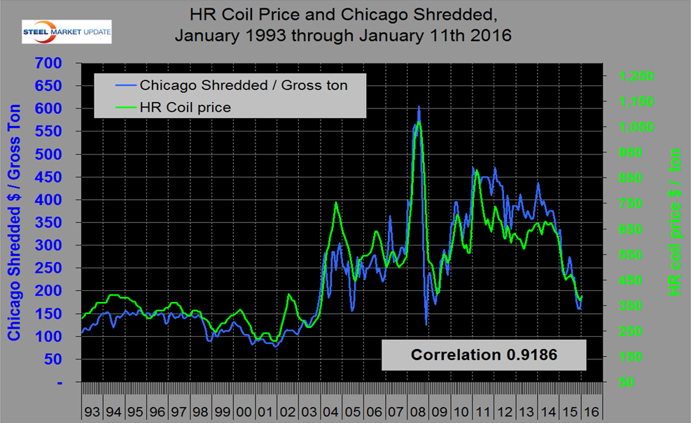 There is a highly correlated relationship between the price of hot rolled sheet and Chicago shredded with no discernible lead or lag as shown in Figure 4. Since 1993 the correlation has been 0.9186 and this was in place even before the thin slab revolution began.