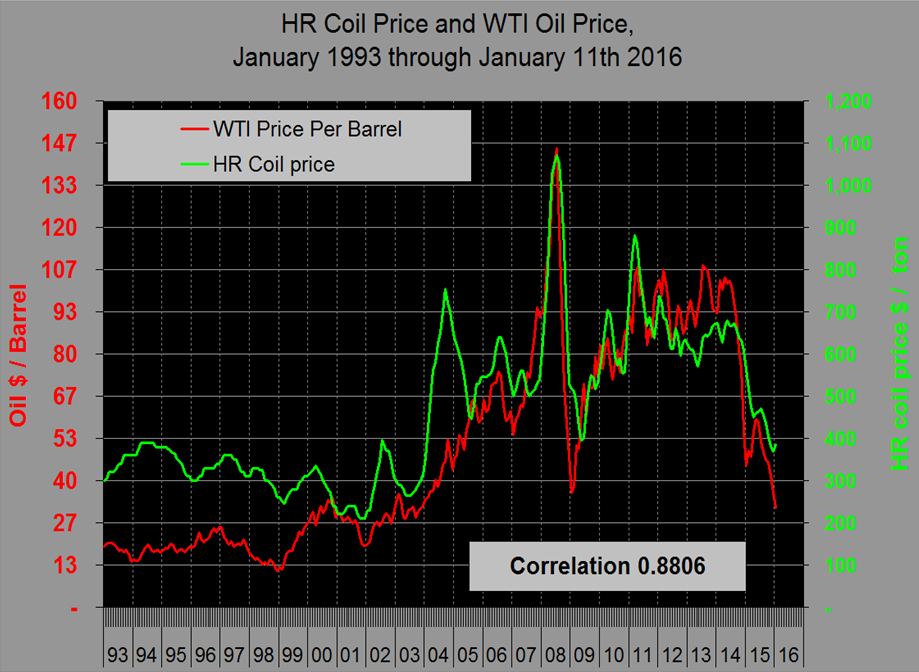 Following up on our piece on scrap price relationships we decided to take a look at hot rolled sheet on a similar basis. The best benchmark we have ever found for the price of scrap is the price of West Texas crude in Cushing, Oklahoma for which the correlation since 1990 has been almost 0.94 or 94 percent.
