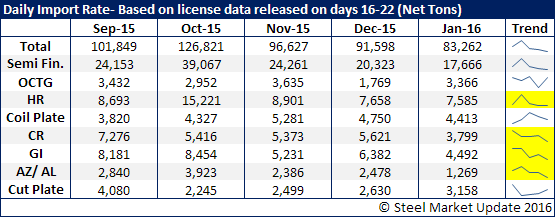 SMU likes to look at the data and compare it against other months at this point of the month (approximately 16-22 days of license data). We want to see how the daily license rate compares and as you can see by the table below January daily rate is below that of September, October, November and December. We have highlighted the four main flat rolled products and provided their trend line during this time period to give you a better feel for the direction imports of these products are headed.