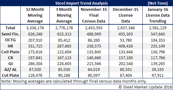 The U.S. Department of Commerce released foreign steel import license data for the month of January. Based on license data through the 19th of January steel imports are trending toward a 2.3-2.5 million net ton month. If the trend continues the month would be well below both the 3 month and 12 month moving averages and in line with November and December.