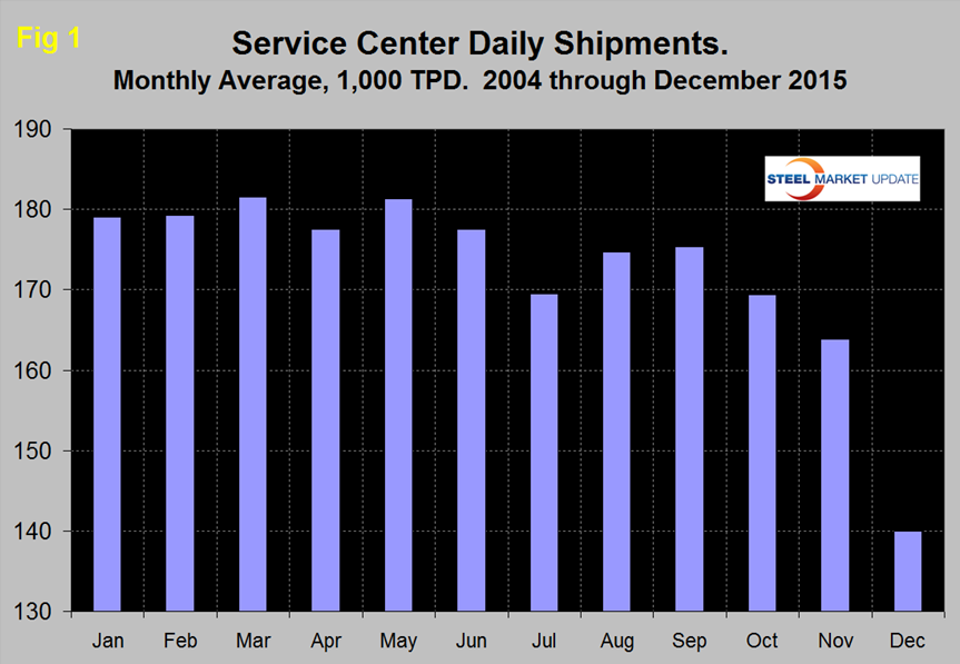 Based on Steel Market Update (SMU) analysis of the recently released MSCI service center inventory and shipment data, total service center carbon steel shipments decreased by 83,900 tons in December to 2.644 million tons. Shipping days at 22, were up by two from November. On a tons per day basis (t/d) shipments decreased from 136,400 tons in November to 120,200 tons in December.