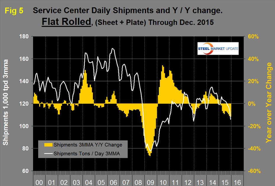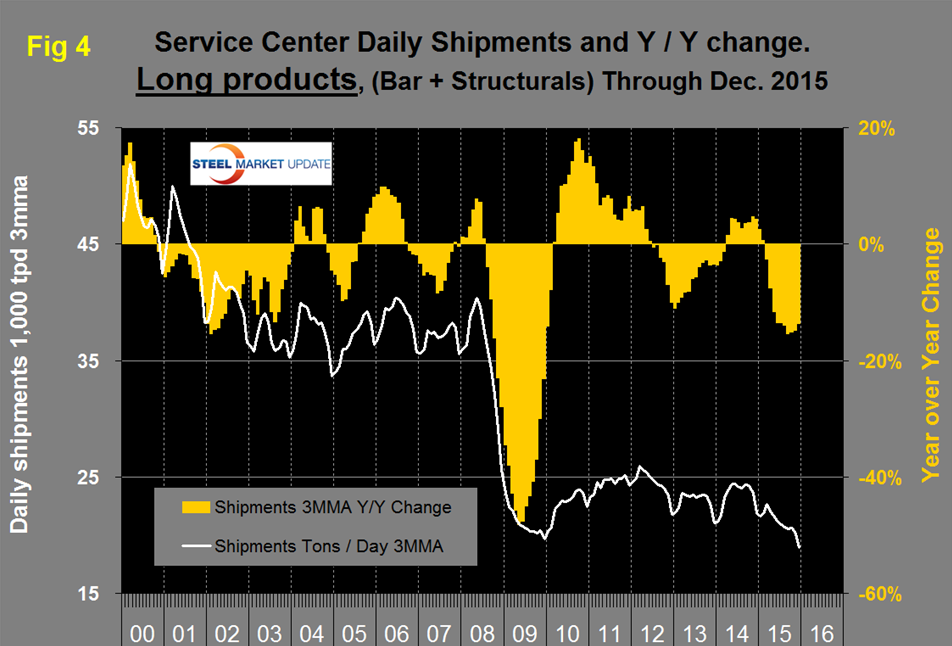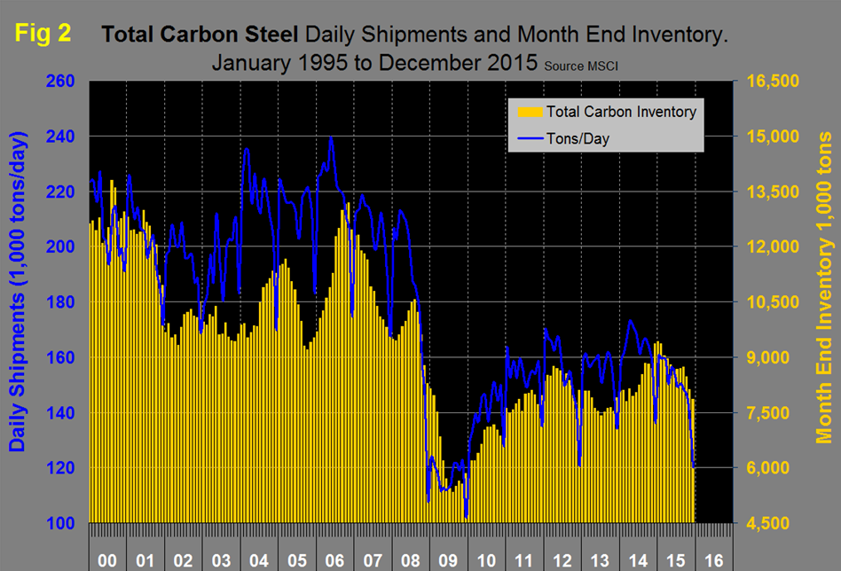 Shipments of all products on a t/d basis were down by 11.7 percent from December 2014 and were 7.8 percent less than the average December shipments for 2015, 2014 and 2013. The fact that the single month y/y growth comparison is worse than the three year comparison is an indication that momentum is negative and the contraction is accelerating. Figure 2 shows the long term trends of daily shipments and month end inventory since 2000.