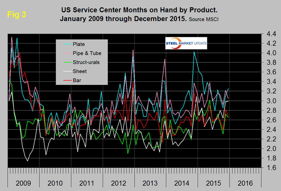 December closed with months on hand (MoH) of 2.97, down from 2.98 at the end of November. All products except structurals had a double digit y/y decrease in MoH. Structurals declined by 8.4 percent. Figure 3 shows the MoH by product monthly since January 2009. Plate has re-gained the top spot after recovering from the extremely high inventory levels at the end of 2014.