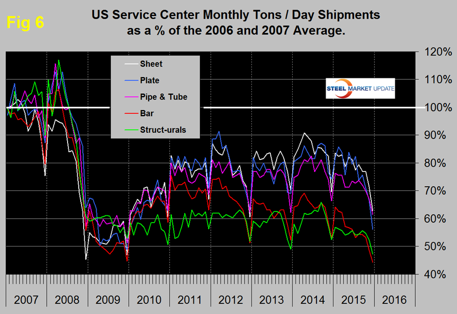Again it can be seen that bars and structurals have the worst record and that bars + light shapes had a particularly severe deterioration in 2015. Sheet, plate and tubulars are now showing a deteriorating trend since mid-year. The total of carbon steel products is now at 56.6 percent of the shipping rate that existed in 2006 and 2007, with structurals and bar at 47.3 percent and 44.3 percent respectively. Sheet is at 62.9 percent, plate at 56.2 percent and tubulars at 61.5 percent.